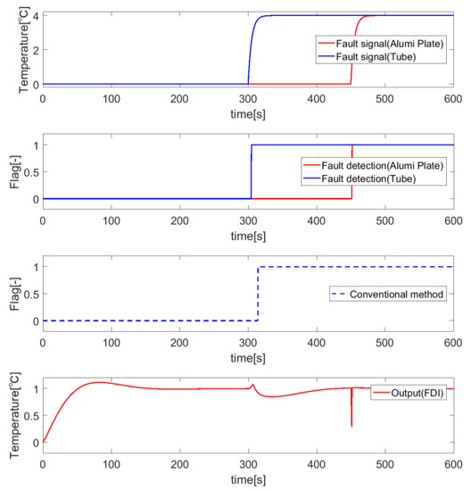 The temperature sensor (tube) rises 4 °C in 300 s as a sensor fault signal shown in the first upper Figure. The second of Figure 10 presents the flag = 1 when fault signal is detected at 304.5 s by using SVM. Compared to the conventional method without SVM algorithm which refers to Deng and Koyama [25], the fault is detected at 314.5 s shown as the dashed line in the third of Figure 10. The simulation results indicate that operator Q with SVM classier is detected 10 s earlier by comparison on the conventional method without SVM classier. From the bottom of Figure 10, the temperature output has presented a better performance of FDI in the case of sensor fault. Therefore, it cannot only maintain safety operation, but also shorten the delay time in fault detection against the uncertainties and noise in the simulation case.