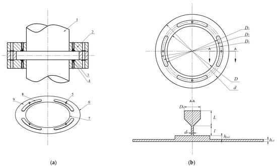 The thrust bearing plays a major role in the axial stiffness and position accuracy of high precision grinding machine. The schematic of the hydrostatic thrust bearing is shown in Figure 2a, the spindle rotates clockwise and moves relative to the thrust bearing, of which 1 is the hydrostatic shaft, 2 is the pad of hydrostatic thrust bearing, 3 is the oil film and 4 is the orifice restrictor, 5 is the oil pressure inlet and 6, 7 are the outlet of inner ring and outer ring respectively, 8 is the oil pad, 9 is the oil film.