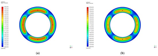 To compare with conventional model method and viscosity-temperature (v-t) model method the static pressure contours are shown in Figure 3. The working condition is given, which supply oil pressure is 2 MPa (20 atm), rotation speed is 2000 r/min, the lubricating oil initial density is 869 Kg/m3 and initial viscosity is 0.00405 Kg·m/s. It can be found from Figure 3 that the pressure gradually decreases from the oil supply position, the position of the inner circle and outer circle outlet is the same as the indoor atmospheric pressure. However, different from the conventional method, the pressure distribution in the v-t method which is shown in Figure 3b, is shifted towards the rotation direction due to the influence of heat generated by the friction between the rotating speed and the oil film.