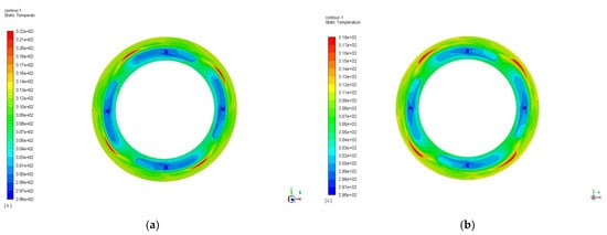 Static temperature contours comparison of conventional model and v-t model. (a) Temperature contour of conventional method; (b) Temperature contour of viscosity-temperature method.