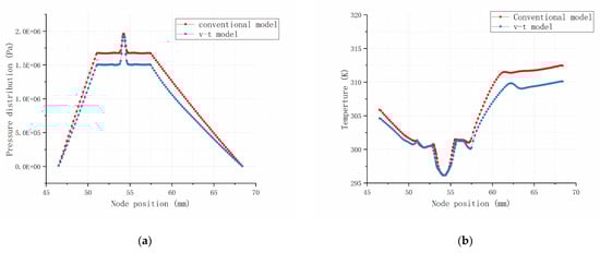 Static pressure and temperature patterns comparison along the slice line A-A. (a) Pressure distribution along the slice line; (b) Temperature distribution along the slice line.