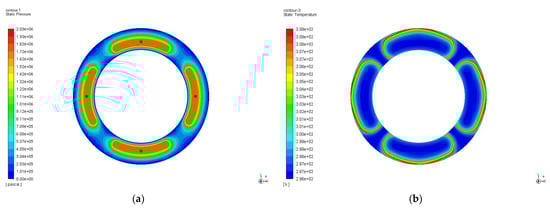 Static pressure contours comparison of conventional model and v-t model. (a) Pressure contour of conventional method; (b) Pressure contour of viscosity-temperature method.