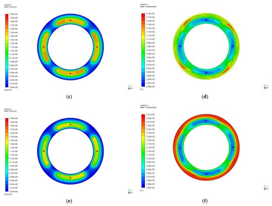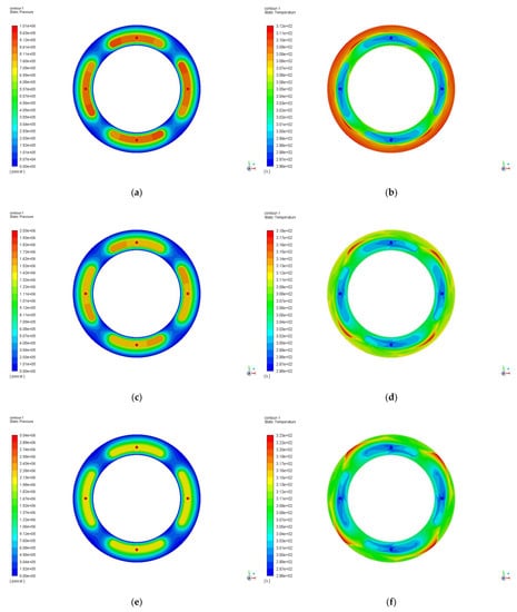 Different from changing the oil supply pressure with constant oil supply pressure, changing the oil supply pressure when the speed is 2000 r/min, the pressure distribution gradually becomes uniform by bias on one side, the maximum static pressure is located in the center of the throttle orifice, it can be found in Figure 8a,c,e. The temperature from the inlet hole to the outlet gradually increases, however, the temperature region is evenly distributed at the outer circle exit of the axial tile at 1 MPa oil supply pressure which is shown in Figure 8b. When the oil supply pressure increases, the highest temperature is mainly concentrated in the position without the oil pad and spreads outward which showed in Figure 8d,f. We can infer that this is because the oil pad can act as an equilibrium temperature. As the oil supply pressure increases, the temperature increases without the position of the oil pad, and when the oil supply pressure is raised, the overall temperature will be more concentrated.