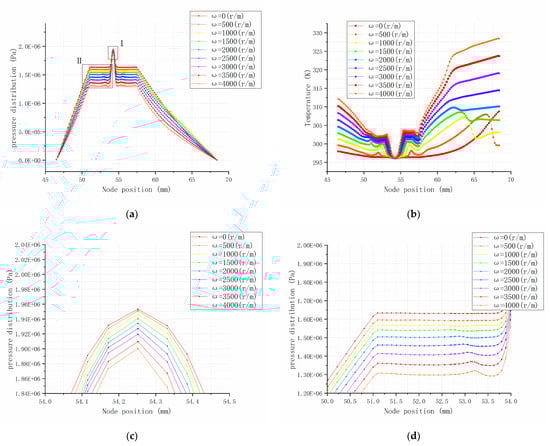 Static pressure and temperature distribution of various rotate speeds along the slice line A-A. (a) Pressure distribution at different rotational speeds (ω = 0~4000 r/min); (b) Temperature distribution at different rotational speeds (ω = 0~4000 r/min); (c) Local enlarged view of I; (d) Local enlarged view of II.