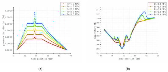 Static pressure and temperature distribution of various supply pressure along the slice line A-A. (a) Pressure distribution at different supply pressure (Ps = 1~3 MPa); (b) Temperature distribution at different supply pressure (Ps = 1~3 MPa).