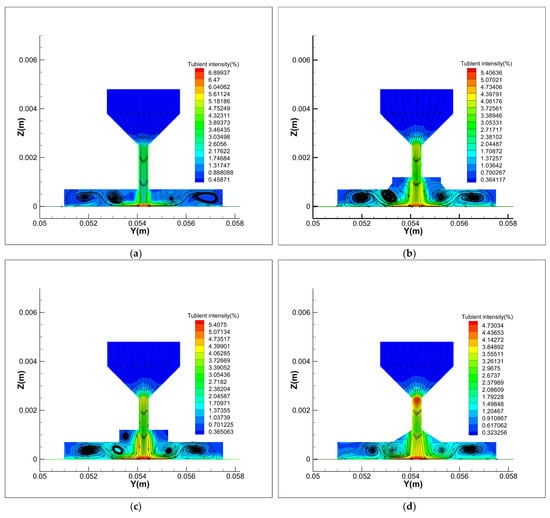 With the improvement of design requirements of thrust bearing, the calculation accuracy is also improved. Therefore, the turbulent fluctuation of the orifice position cannot be ignored. When the pressure of the oil inlet is 2 MPa and the rotation speed is 2000 r/min, the turbulence intensity model of the four configurations are compared to reduce the pressure fluctuation of oil film caused by the turbulence of the oil inlet. Figure 10 is shown the contours of turbulence intensity and the track of velocity of four different orifice types. These four types are mainly given according to the common machining configurations mode of orifice.