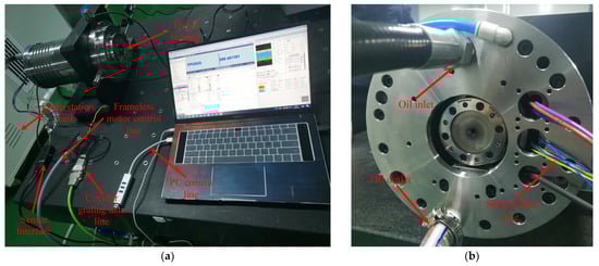 In order to verify the validity and accuracy of the simulation, we carried out experiments on the above calculated conditions []. To ensure that the thrust surface of the hydrostatic bearing is not affected by external force, the transverse position of the bearing is used to measure the thrust surface shown in Figure 11a. The lubricating oil pump is fed into the bearing through the oil pump, the cooling water tank is used to ensure the initial oil supply temperature is 296 K. Driven by a Kermorgan frameless motor at the end of the bearing, the maximum rotational speed is 5000 r/min.