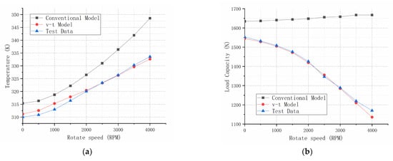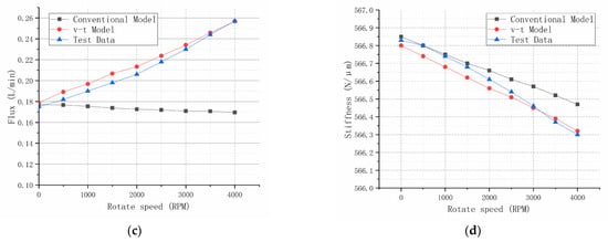 In this paper, it can be found that the variation trends at different rotation speeds from 0 to 4000 r/min as illustrated in Figure 13. The average temperature has an obvious increasing trend with the increase of rotating speed, with the shear thinning effect, the trend of temperature rise is lower than that of conventional models. This is confirmed by experimental values, because of the measured oil outlet temperature, the temperature is slightly lower than the simulation value but the tendency is almost uniform, which is shown in Figure 13a. In the no-load condition, the average bearing capacity of thrust surface decreases with the increase of rotational speed. The result of the v-s model is closer to the experiment, because with the increase of rotating speed, the viscosity decreases with the increase of temperature. When the hydrostatic bearing rotates at high speed, the circumferential shear force will reduce the axial force, as can be seen in Figure 13b. Different from the conventional calculation model, the flow rate of lubricating oil gradually increases with the speed. This is also confirmed by the experimental data which is shown in Figure 13c. The axial stiffness of the spindle decreases with the increase of rotational speed in Figure 13d, when the rotation speed is at 4000 r/min, it is most obvious that the v-t model is closer to the actual measured value.