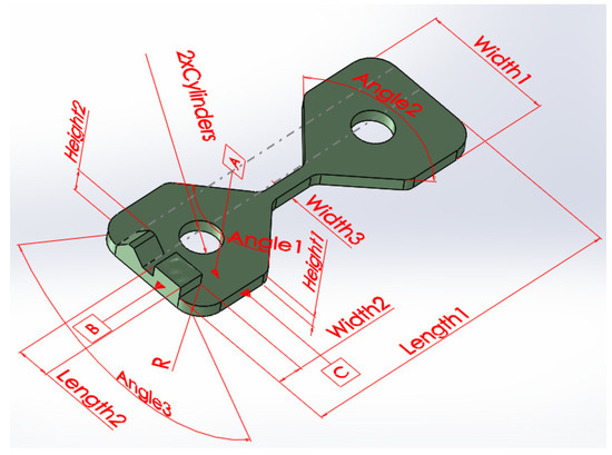 A test part presented in Figure 2 is designed using the SolidWorks [9] software suite. The geometry of the test part is chosen to amplify the effects of process parameters on the dimensional and mechanical characteristics of the manufactured parts. A high length to thickness ratio increases the effect of part warping during cooling. A low surface area zone (marked as Width3 in Figure 2) is used as a breaking point for tensile strength measurements as well as for amplifying the effects of different parameters on surface quality. A transition from a low to a high surface area defined by Angle1 and Angle2 is used to determine the variation of surface quality while at the same time providing a possible clamping feature for tensile strength measurements. The test part geometry includes different linear and circular features, which can provide measurement data for different layer orientations. The part is designed and annotated according to ISO 1101 [10].