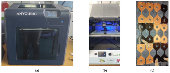 Machines used for manufacturing test parts, (a) Anycubic 4Max Pro 2.0, (b) Leapfrog Creatr HS and (c) sample of manufactured parts.
