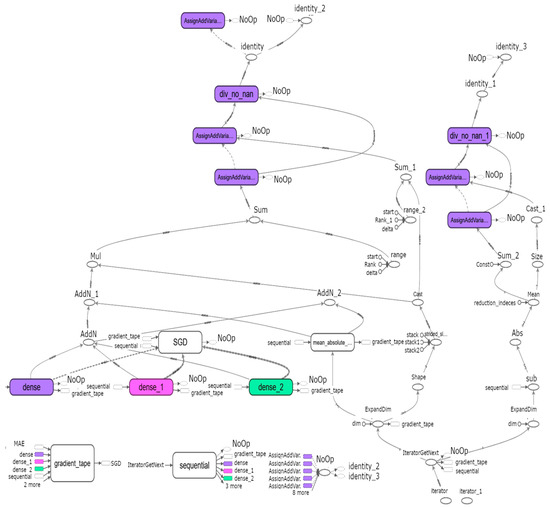 A graphical representation of a neural network analysed in this study showing the path of the data and the operations performed throughout the network during training is presented in Figure 5, showing the path of the data through the neural network. Data enters through the dense layers (dense, dense_1, dense_2), where an inference (prediction) is made. The result of the inference is used in combination with the actual value to compute the Mean Absolute Error (MAE). The error is used to adjust the value of the weights and biases to a degree determined by the optimiser employed, i.e., for Figure 5, the optimiser used is Stochastic Gradient Descent (SGD). The network design also employs functions to prevent NaN scenarios. The data is normalised (values scaled between 0 and 1) externally to allow for better portability of the model. Normalisation is performed to increase the speed of convergence by reducing the difference in scale between the various parameter values. Data normalisation is optional; however, it can increase model performance and decrease convergence times. The normalised data takes values from 0 to 1 but preserves the relative ratios between the original values.