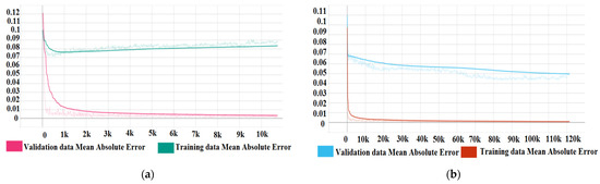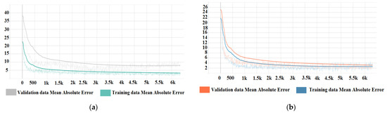 The interpretation of the plot is as follows: Two lines are plotted, one for training predictions and one for validation data predictions, as mentioned above. If the two lines show a tendency, however small of their respective mean absolute error, it indicates that the model can approximate a correlative predictive function for the input and output parameters and is also capable of generalising. If the lines show a tendency to diverge, i.e., the MAE of the training predictions decreases while the MAE of the validation data predictions increases, the model is considered to overfit the data, i.e., it starts to memorise data rather than approximate a predictive function. If the lines show a random distribution on the plot, this indicates that the model can not find a predictive function and a correlation between the input and output parameters.
