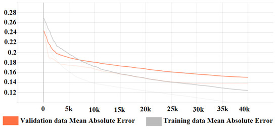 Artificial neural network development is performed using the Python [21] programming language through the PyCharm [22] Integrated Development Environment. To facilitate universality and cross-platform availability of the code, as well as to use various functions and tools optimised for machine learning, the neural network architectures are developed using the TensorFlow [23] machine learning library with the Keras [24] frontend. The architecture and performance of the tested neural networks are analysed using the TensorBoard [25] visualisation kit for TensorFlow. The performance analysis is displayed as a plot of ‘Training accuracy’ Vs. ‘Predictions on validation data’ accuracy in the form of the Mean Absolute Error (MAE) between predicted and actual values. A tendency of the MAE values to decrease indicates the ability of the model to learn the complex correlative function and the ability to generalise. The Mean Absolute Error metric is defined by Equation (1),