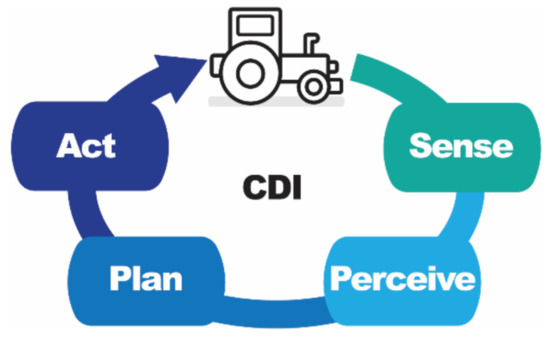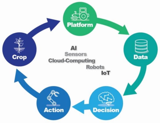 Agriculture 4.0, also known as Digital or Smart Farming, incorporates precision agriculture principles and data processing to assist farmers’ operational decisions [2,3]. Smart farming provides a practical and systematic tool that aims to detect unforeseen problems that are hard to notice either due to the lack of experienced workers or due to large-scale farms that are difficult surveil. Going one step further, Agriculture 5.0 incorporates robotics and AI algorithms to already existing data-driven farms [1,4], implying autonomous decision systems and unmanned operations. The concept of Agriculture 5.0 along a crop management cycle is illustrated in Figure 1. The crop management system starts from the crop. Spatial measurements of crops imply on-the-go in-field monitoring platforms. The platforms collect data from the crop, soil and environment through remote sensing and provide spatial inputs to the decision system. AI algorithms are employed for effective real-time decision-making and action, driven by the decision system, occurs as a reaction to the sensory feedback. The process is repeated throughout the crop’s life cycle. The advent of robots [5] and non-invasive sensors with their simultaneous reduction in size [6], emerging digital technologies such as remote sensing [7], the Internet of Things (IoT) [8] and Cloud Computing [9], support the process.