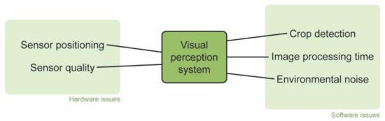 The perception system includes optical sensors. The quality and positioning of the sensors are crucial, since proximal sensing can derive comprehensive data. A camera mounted on the cab can view more than one mounted on the head of the tractor. The height of crops can also restrict the crop row detection ability of the system. Tractors are ground vehicles; therefore, acquired sensory data is in crop scale and can be characterized by increased accuracy and high resolution. When the data is of such high quality, environmental conditions such as lighting and shadowing may severely deteriorate the accuracy of the system [50]. Figure 3 summarizes the main issues related to errors of the visual perception systems of self-steering tractors.