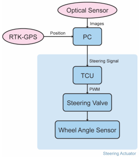 The main sensor of the architecture is an optical sensor. The optical sensor captures images that are processed by a computer (PC), which also receives real-time kinematic global GPS (RTK-GPS) information and extracts the steering signal. The steering signal is fed to the tractor control unit (TCU) that generates a pulse width modulation (PWM) signal to automate steering. The closed loop of the steering actuator is comprised of an electrohydraulic steering valve and a wheel angle sensor. The system prototype of Figure 5 was installed on a commercial tractor, and a series of self-steering tests were conducted to evaluate the system in the field. Results reported a root mean square (RMS) error of lateral deviation of less than 0.05 m on straight and curved rows for speed of up to 3.0 m/s.