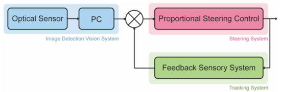 The basic design principle of a path-tracking control system comprises three main systems, as depicted in Figure 6: image detection, tracking and a steering control system. Acquired images from an optical sensor, i.e., a camera, are sent to a computer for real-time processing. The center of the crop row line is identified, and the navigation path is extracted. The system uses a feedback sensory signal for the proportional steering control of the electrohydraulic valve of the vehicle for adaptive path tracking [57].