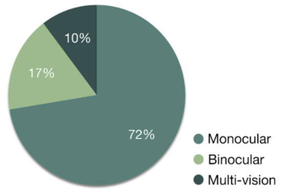 According to the revised bibliography, it has resulted that multi-vision and stereovision systems are superior to monocular vision systems and meet the agricultural requirements for navigating vehicles in the fields. However, monocular systems are more often found in the literature, according to Table 2. The latter can be better visualized in Figure 8. This is due to the simpler system design, the comparatively low-cost of the monocular vision sensors and the less complex image processing algorithms that accompany them. Additionally, although the use of one camera is affected by environmental noise, navigation results still range to sustainable levels of accuracy, allowing monocular vision systems to drive a tractor safely.