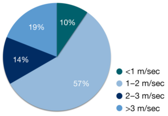 Future work may include state-of-the-art sensors and algorithms for newly introduced vision-based system architecture. Regarding image processing algorithms, there are several issues to be addressed. First, algorithms must balance the processing of large amounts of data from the environment with low processing times so that decisions can be made in real time. Complicated and multiple input data may provide a better understanding of the surroundings, yet result in increased processing time, obstructing the real time control and actions of the tractor. Second, optimal navigation accuracies are achieved with multi-sensor systems; vision, although flexible, is affected by environmental noise. A variety of sensors can lead to advanced accuracies in navigation, mapping and the position estimation of tractors. Therefore, future work must focus on fusion techniques that are able to deal efficiently with data from multiple sensors. Factors such as the variation of the vehicle’s speed, irregular terrain and varying controllers should also be considered. Figure 9 summarizes the range of maximum navigation speeds at which the best performance of the algorithms in Table 2 were obtained. It seems that the optimal speed for a tractor is between 1–2 m/s, which is fast enough for sustainable automation and sufficient for the data processing of the autonomous navigation algorithms. However, it should be noted that speeds over 2 m/s are usually used in cultivations with tall (e.g., corn) or dense plants (e.g., cotton), where the crop line is theoretically detected more easily.