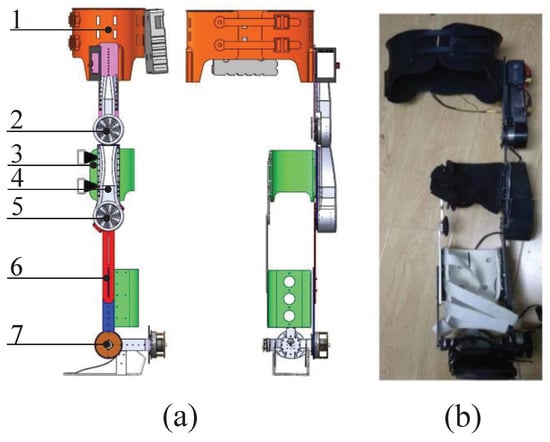 The mechanical structure of the single-legged exoskeleton. (a) 3D model. 1. Waistband. 2. Hip joint. 3. Belt. 4. Thigh link. 5. Knee joint. 6. Shank link. 7. Ankle joint; (b) real model.