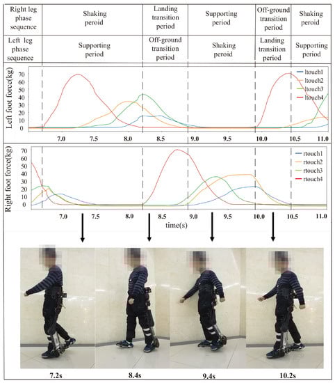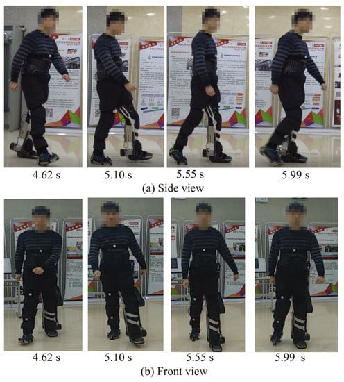 In order to verify the effectiveness of the adaptive adjustment strategy of gait characteristics, five men were selected as experimental subjects to complete the walking experiment of wearing an exoskeleton. The relevant information of the experimental subjects is shown in Table 1. As shown in Figure 4, the lower limb exoskeleton is worn on the left leg, and WSSS sensor and planta pressure sensor are worn on the right leg. The assisted walking experiment of wearing an exoskeleton was completed on the horizontal ground. With the exoskeleton power on and the upper computer program running, the subject will be able to walk with the assistance of the exoskeleton. Moreover, the program of the upper computer and the structure design of exoskeleton can limit motor torque and the range of joint angle, so as to ensure the safety of the subject. Figure 9 shows the actual walking gait picture of the subject taken from multiple angles during the experiment. The time below the picture is the time point taken during the actual walking.