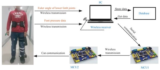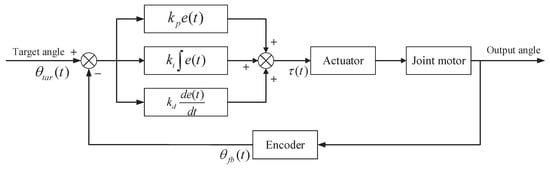 The MCU1 is the controller connected to the upper computer, and MCU2 is the controller connected to the single-legged exoskeleton. The patients wear the exoskeleton and sensors, which transmits the data of healthy leg joints and foot pressure collected by the sensor to the upper computer via a USB wireless receiver. The upper computer calculates the angle of the adjacent WSSS sensor coordinate system, and uses inverse kinematics to obtain and store the joint angles of the hip and knee. Then, these data are sent to MCU1 through serial port. The data transmission between MCU1 and MCU2 is completed by wireless transmission. The data received by MCU2 are internally settled according to the defined protocol, and a CAN bus is used to communicate with the actuator to realize motor control. The PID algorithm was used to complete motor control. According to the data feedback of the exoskeleton joint motor encoder, the closed-loop PID control is carried out to control the exoskeleton motion accurately. The PID control diagram is shown in Figure 5. In the figure, is the target angle of the joint motor, is the feedback angle of the joint motor, and is the current to the actuator calculated by the PID algorithm. It is worth mentioning that the upper computer still continuously receives the Euler angle and foot pressure of the healthy leg transmitted by the sensor, then works out the joint angle of the healthy leg in real time in the practical application stage of the exoskeleton robot. Then, the motion intention of the patient can be predicted based on the foot pressure, and the stride length and stride frequency of the gait data are adjusted by the walking characteristics recognized from the data of sensors fixed on the healthy leg. Finally, the adjusted joint angle is sent to the lower computer.