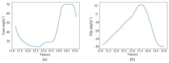 The joint angle data of normal walking in one gait cycle. (a) knee joint. (b) hip joint.