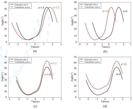 where a, b, c, and d represent the four parameters added to the original curve equation. Formula (5) can be simplified to . By changing these four parameters, we can shift and stretch . Take the knee joint curve equation as an example to perform the stretching and shifting curve to verify the above assumption. We set the initial values of a, b, c, and d are 1, 0, 1, 0 respectively, which satisfies = . We follow the control variable principle for the more obvious contrast effect. Parameters a = 1.2, b = 1, c = 1.2 and d = 10 are respectively changed to obtain the curve comparison graphs before and after transformation, as shown in Figure 8.