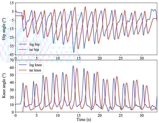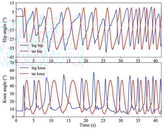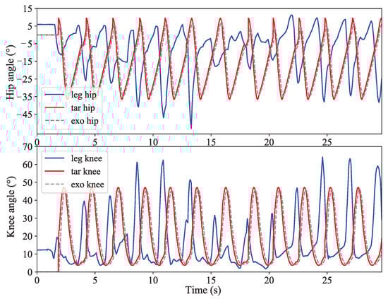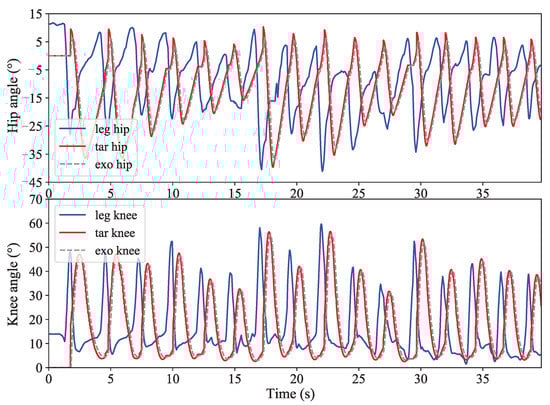 Firstly, the experimental results of setting stride frequency parameter a = 1 and correcting stride length parameter c in real time are discussed. Since the experimental results of the five subjects had the same conclusion, the experimental results of one of them were selected for analysis. Figure 10 is the stride length adjustment curve of one of the subjects. In the figure, “leg hip” and “leg knee” are respectively the angle change curves of the hip joint and knee joint of the healthy leg of the subject. “tar hip” and “tar knee” are respectively the target curves of the hip joint and knee joint of the exoskeleton calculated based on the stride length of the healthy leg. As can be seen from the figure, the period of the target curve is fixed, and the amplitude changes with the change of the healthy leg. The amplitude of the healthy leg’s hip and knee angle gradually increased, as did the amplitude of the exoskeleton’s joint angle before 15 s. In addition, the amplitude of the hip and knee angle of the healthy leg gradually decreased, as did the amplitude of the joint angle of the exoskeleton after 15 s.