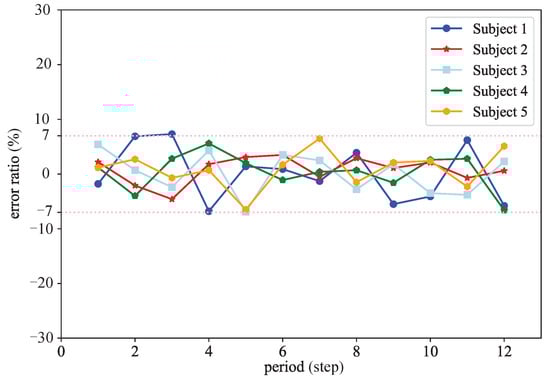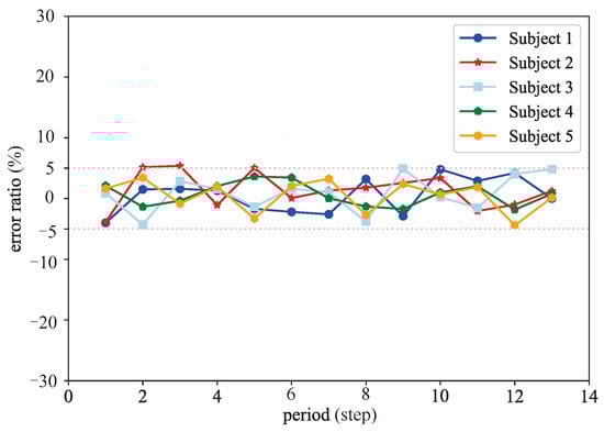 where is the period of one step of exoskeleton walking, and is the period of one step of healthy leg walking. Figure 13 shows the line chart of relative error of stride frequency tracking of five subjects. The walking period following error of the five subjects was within ±7%; that is to say, the walking speed of the exoskeleton was consistent with that of the healthy leg, which verified the effect of parameter a on adjusting the stride frequency.