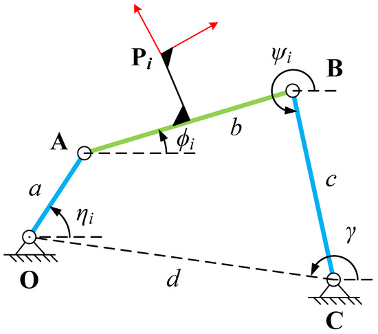 Generally, we hope that the four-bar linkage has a crank that can fully rotate, so that the linkage can be driven by a continuously rotating motor. In this paper, we take the crank–rocker four-bar mechanism as the research object. All links lengths of the four-bar linkage can be obtained after the synthesis constraint equations are solved. As shown in Figure 2, a, b, c, and d denote the lengths of link , , , and , respectively.