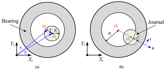 The orthogonal unit vector of is denoted as , and we obtain it by rotating anticlockwise by 90. When the journal is in contact with the bearing, the position vector of contact point relative to is denoted as , and its expression is the following: