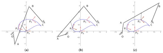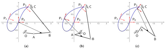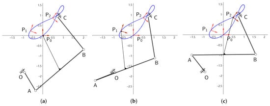 where operator “×” denotes the cross product symbol, [•] represents sign function, and denotes the third component of vector . If remains the same sign, it indicates that the linkage can orderly arrive the task positions when the crank rotates in clockwise or anticlockwise.