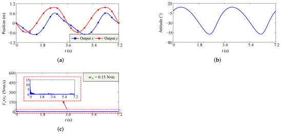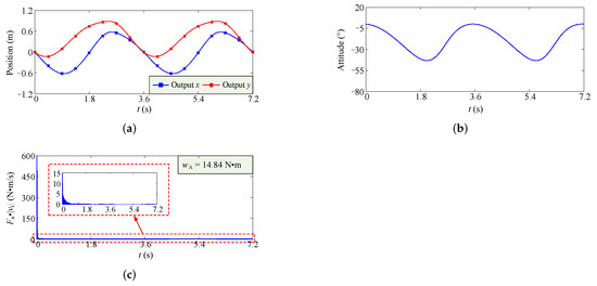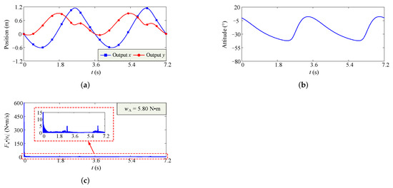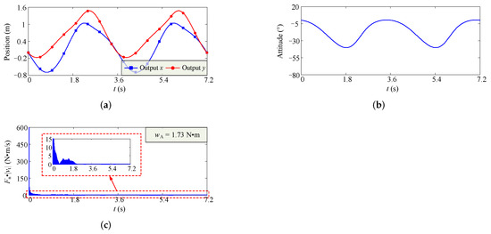 The results of dynamics simulation for the configuration of the minimum . (a) Variation curves of output position. (b) Variation curve of output orientation. (c) Variation curve of .