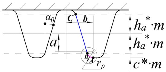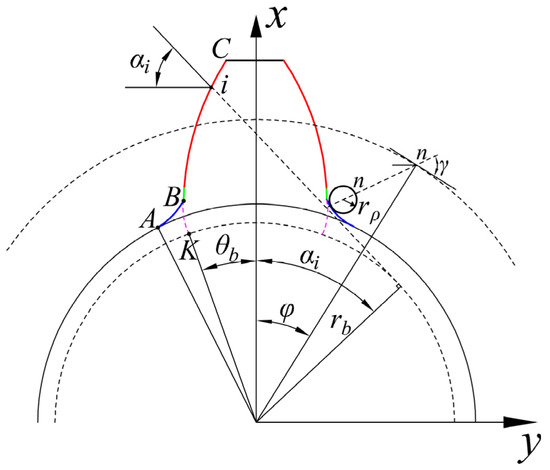 The tooth profile of high contact ratio gear comprises tooth tip arc line, involute tooth profile, and tooth root transition curve. The motion of a rack-type cutting tool is equivalent to the meshing of the rack and pinion. In the process of machining, the cutter’s machining pitch line is always tangent to the gear’s machining pitch circle [26]. The profile of the rack-type cutting tool is shown in Figure 1. As presented in Figure 2, during gear machining, the involute part of the tooth profile is cut directly by the straight part of the cutter (BC), and the fillet part of the cutter (AB) cuts the transition part. The transition part is the isometric curve of the extended involute. This extended involute is depicted by the center of the tool’s rounded corner. An x–y coordinate system with the center of the gear as the origin is shown. The gear teeth are usually considered as a cantilever beam of a variable cross-section. The coordinates of any contact point: i, on the involute part are expressed as follows.