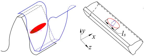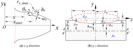 Many tooth surface spalls have progressively varying depth and a curved base surface in practice as shown in Figure 3. The ellipsoid tooth spall is formed by removing the intersection of the gear and the ellipsoid. As shown in Figure 4, the ellipsoid tooth spall’s maximum width, length, and center depth are ws, ls, and hs, respectively. The starting and ending position is denoted by xstart and xend, respectively. θs is the angle between the tangent of tooth spall and involute curve. In this work, the position (xstart, θs) and the severity (ws, ls, hs) are fixed.
