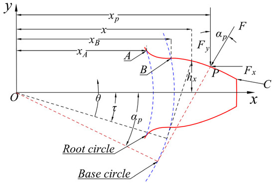 Figure 5 shows the gear profile. Segments AB and BC represent the transition curve and involute curve, respectively. P is the meshing point, and the corresponding pressure angle is αp. F denotes the meshing force that is decomposed into Fx and Fy, respectively. Based on the potential energy method [27], comprehensive mesh stiffness k(t) is deduced.