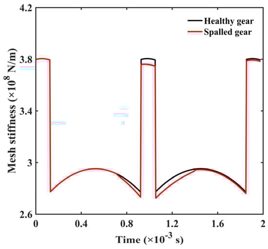 Figure 6 shows the curve of mesh stiffness. The incidence of tooth spall reduces the mesh stiffness. A localized spall fault is considered. Hence, it occurs once per revolution. Thus, compared with the healthy gear, the reduction in mesh stiffness occurs mainly in the double-tooth and the triple-tooth zones.
