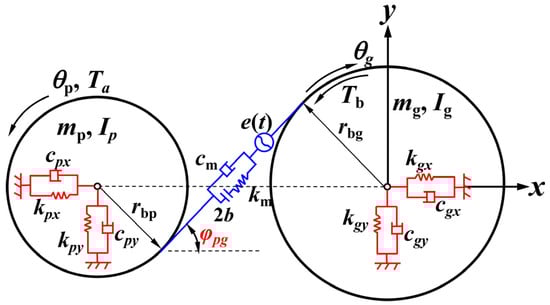 m, I, T, and θ represent the mass, moment of inertia, torque, and torsional angular displacement, respectively. Subscripts p and g indicate quantities associated with pinion and gear, respectively. rb, kx, and ky denote the base circle radius, vertical radial support stiffness, and horizontal radial support stiffness. The time-varying meshing stiffness, meshing damping, and backlash of the gear pair are expressed by km, cm, and 2b, respectively. e(t) is the comprehensive static error along the tangent direction of the gear base circle.