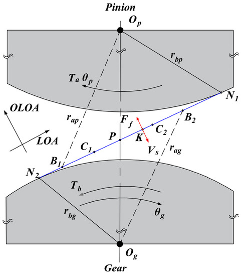 b0, λ, Ra1/Ra2, and D1/D2 denote initial gear backlash, characteristic scale coefficient, actual surface roughness, and fractal dimension, respectively. Rac(D) is the function to get the corresponding Ra with a particular fractal dimension, which can be obtained from the reference [30]. The friction force between tooth surfaces during gear meshing is deduced as follows.