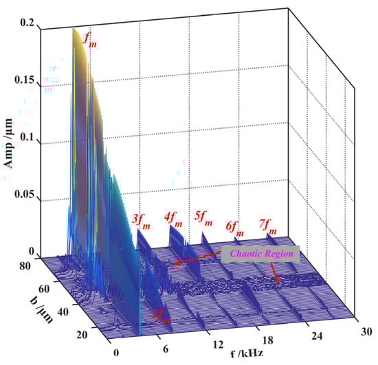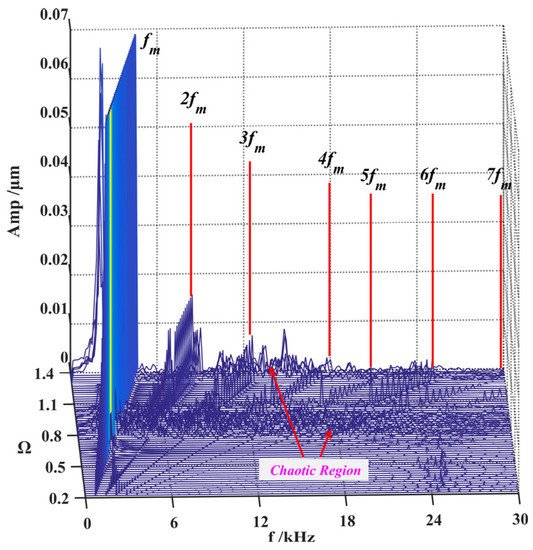 As shown in Figure 11, the main components of the spectrum of gear system are composed of the meshing frequency and its harmonics. In the chaotic region, the frequency spectrum is a continuous line. The value range of the chaotic regions is also inconsistent with Figure 10.