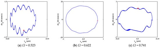 The system is in periodic motion at low excitation frequency, as shown in Figure 12a,b. When Ω equals 0.6218, resonance occurs in the system. The system enters chaotic regions A1, A2, and A3 sequentially with the increasing excitation frequency. The system follows quasi-periodic motion between the chaotic regions, as shown in Figure 12e to Figure 12h. How the systems enter chaos is different. The system enters chaotic region A1 through quasi-periodic motion, as shown in Figure 12c,d. However, the system enters chaotic regions A2 and A3 by way of crisis, as shown in Figure 12i–l.
