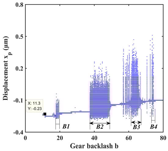 Gear backlash is one of the main nonlinearities of the system. It generally changes the wear and the deformation of components of the system. The excitation frequency was set as a constant value (Ω = 1.2), and the other parameters remained unchanged in the study of bifurcation characteristics of the system.