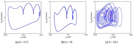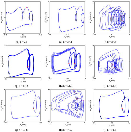 The bifurcation diagram and three-dimensional frequency spectrum are shown in Figure 13 and Figure 14, respectively. Both cases have the same trend in motion state transitions. Several frequency jumps exist in the bifurcation diagram, for example, at b equals to 11.3. Various motion patterns such as single periodic motion, multi-periodic motion, quasi-periodic motion, and chaotic motions are seen within the rotational speed range. There are mainly four chaotic regions in the bifurcation diagram, namely B1, B2, B3, and B4. The way the system enters a chaotic region is different. The system enters B1, B2, and B4 through quasi-periodic motion, as shown in Figure 15b,c,e,f,j,k. However, the system enters B3 through the period-doubling route, as shown in Figure 15h,i.