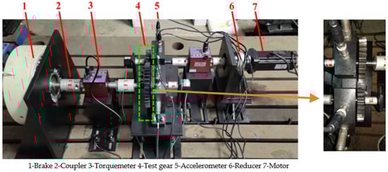A single-stage high-contact-ratio gear test rig is designed and developed to validate the dynamic model. Dynamic characteristics under different speed conditions to imitate real-life applications are studied. The test rig is set up at the Anhui Digital Design and manufacturing laboratory, Hefei University of Technology, China. It can measure the acceleration, acting load, and rotational speed of the system. The gearbox is coupled to the servo motor, which has a maximum speed of 3000 rpm. The prime mover is Delta make with a power capacity of 0.75 kW. ZHY-6001 piezoelectric accelerometers measure the vibration signals of the system. Two DYN-200 torque transducers track the rotational speed and torque of the gear system. A data acquisition system ZHKJ-1001 with six channels is used. The sampling rate for the experimental trials is set at 10 kHz. The experimental setup and test gears are shown in Figure 16. High-contact-ratio gear is a non-standard part. Thus, the test gears are machined by slow wire cutting. Tooth spalling defects in the gears are generated with the electric mill.
