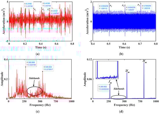 The comparison between the experimental and simulated signals in the time-domain and frequency-domain is presented in Figure 17. The gear vibration signal contains a lot of interference noise caused by the operation of mechanical equipment. The white noise of the ambient background appears in its full frequency band. In this paper, the moving average method is used to denoise the collected experimental signals. The rotational frequency of pinion and gear is fp (fp = np/60 = 10 Hz) and fg (fg = 8.7 Hz), respectively. The pinion’s meshing frequency and meshing are fm (fm = zp ∗ fp = 270 Hz) and Tp (Tp = 1/fm = 0.0037 s). The characteristic fault frequency is fs. It is the reciprocal of the failure period and can expressed as follows.