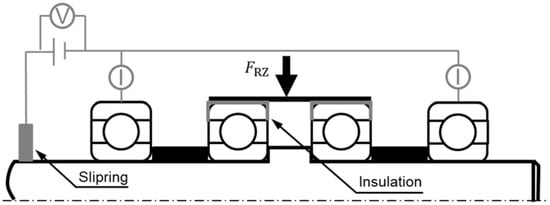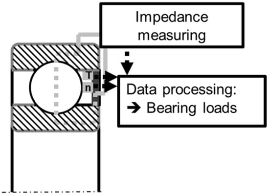 The increasing digitalization in mechanical engineering leads to a demand for new, integrated sensor solutions. Martin et al. [] have presented a sensor concept, shown in Figure 1, in which the electrical impedance of rolling bearings is measured to estimate the bearing load. With the use of the sensing bearing concept it is possible to implement predictive maintenance and process monitoring more easily in new and existing machines based on load data. The technology is based on the relationship that elasto-hydrodynamic lubricated contacts have a capacitive behavior, which leads to a measurable electrical impedance in an alternating current circuit []. The voltage levels of the sensor concept are below harmful values as mentioned in []. The literature gives analytical models to describe this effect, but they have an accuracy that is not sufficient to use the models as sensors. For this reason, the models available in the literature were extended in Schirra et al. [] so that a much more accurate analytical calculation of the bearing impedance is possible. Despite the improvements in the models achieved, there is still a discrepancy between calculated and measured values.
