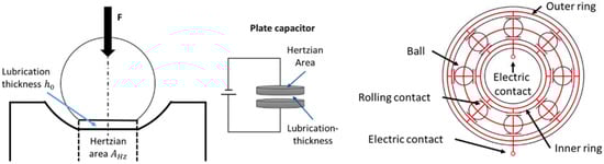 The loaded contact is described using the notion of a plate capacitor with the Hertzian contact area and the operational lubricant film thickness as shown in Figure 3. According to common literature the lubricant is assumed to be an isolator with the specific permittivity . The nominal capacity is calculated by: