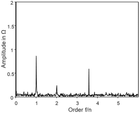 The amplitude spectrum is calculated by a fast Fourier transform of the one second long, high-frequency sampled time signal. Figure 8 shows the typical frequency spectrum of rolling bearings. Here the amplitude is plotted over the order, where the measured frequencies are related to the rotational speed .