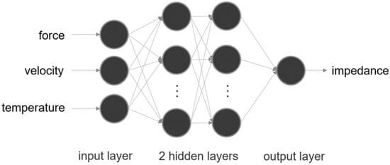 Due to the design of the experiments, the available input parameters are the radial force acting on the rolling bearing, the oil temperature of the bearing and the shaft speed []. All measured parameters have meaningful effects on the measured output parameter, the electric impedance [,]. These assumptions can be confirmed by correlation analyses. In addition, an uncorrelatedness between the different input parameters can be affirmed. Thus, all measured quantities can be used for the prediction of the impedance. Due to the physically based assumptions, this is a grey box model, which approximates the so far insufficient analytical correlation between input and output.
